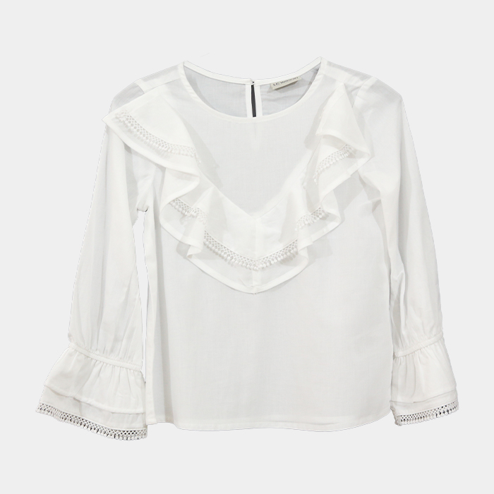 Girls long sleeve school shirt with lace on sleeve cuff and front. Garments manufactured by Posh Garments in Bangladesh.